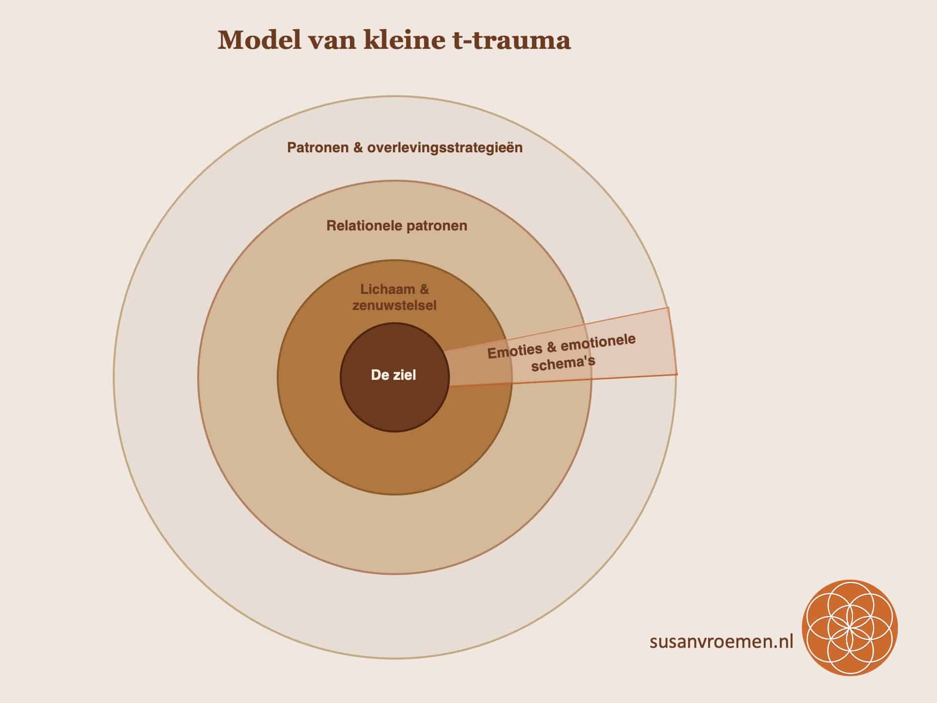 Samen laten deze cirkels zien hoe kleine t-trauma doorwerkt op verschillende lagen van je bestaan.