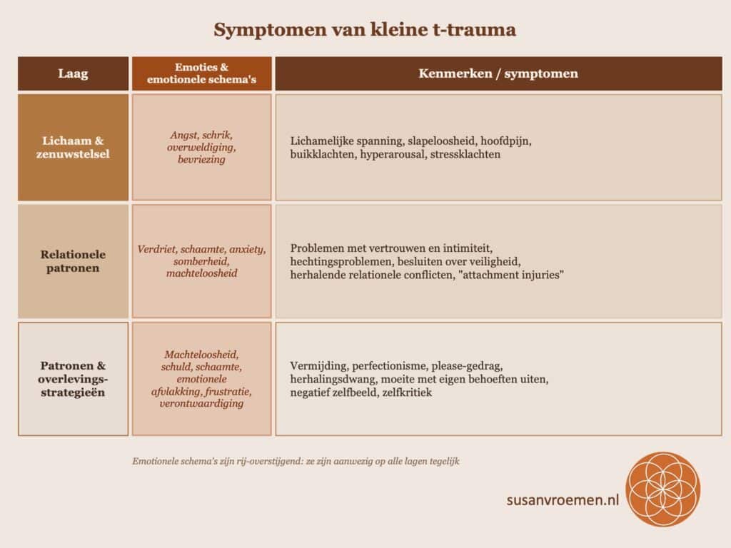 - Symptomen van kleine t-trauma zie je vaak terug in je lichaam, je emoties, je relaties en de patronen waarmee je je staande houdt.